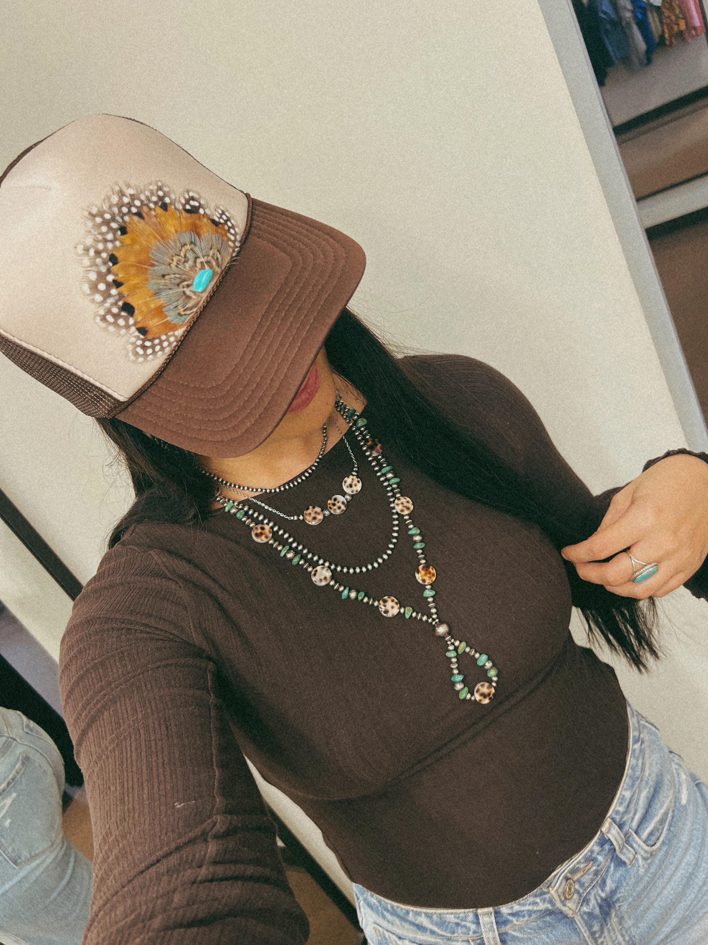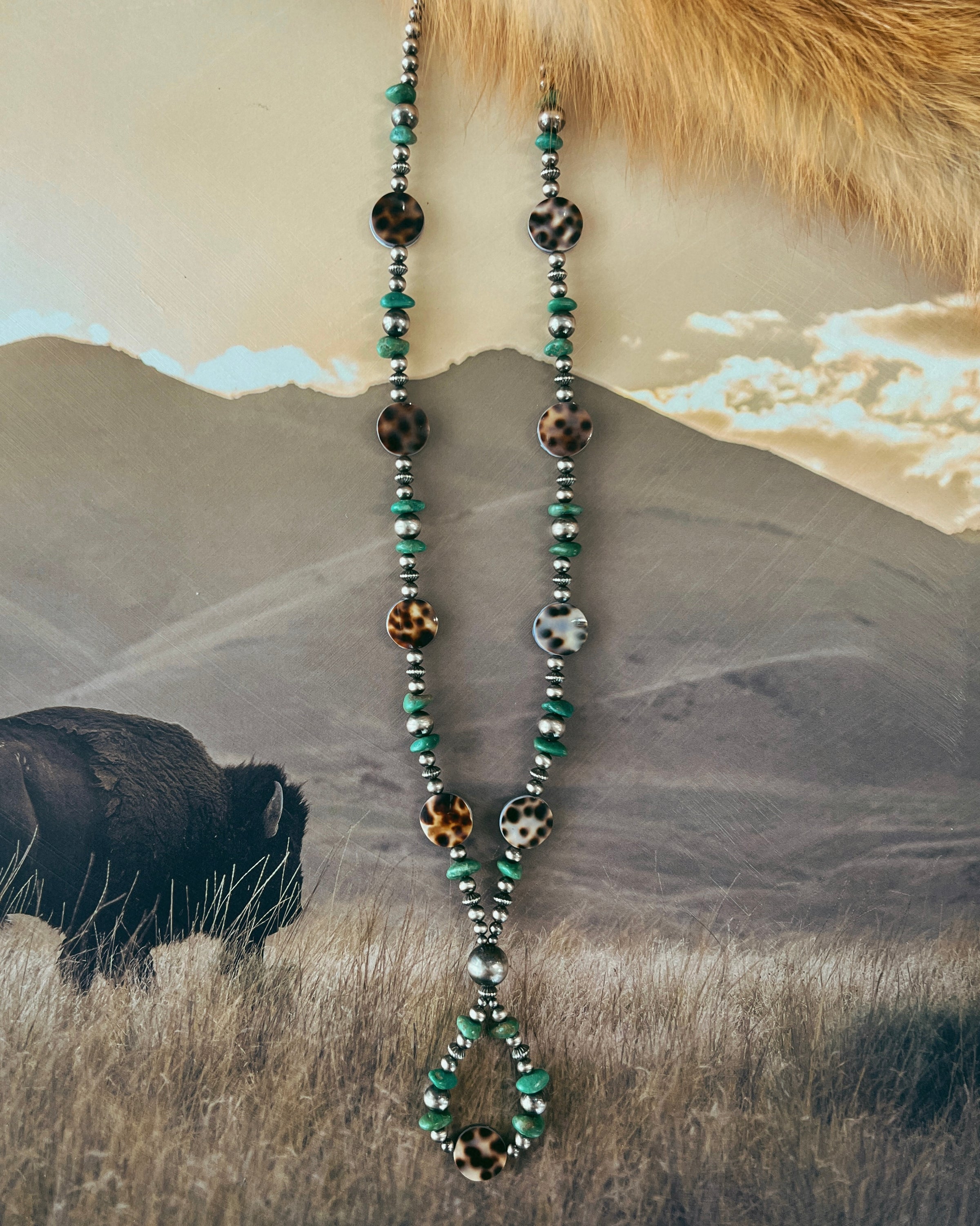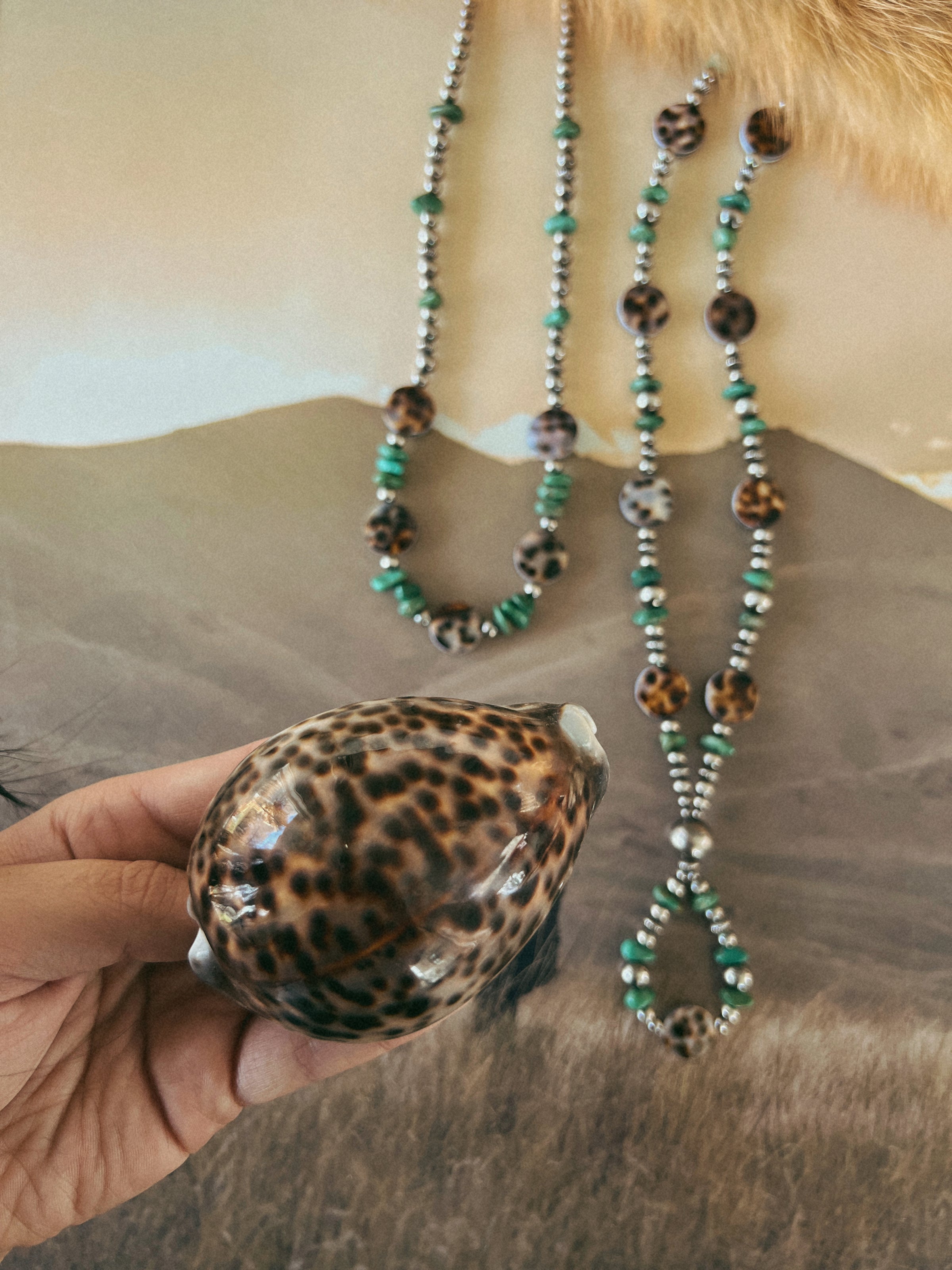 Real, raw and natural cheetah print shell? Say less. One of my most favorite pieces in this collection! An absolute STUNNER! Crafted from sterling silver 4mm/5mm/8mm pearls, green Elise turquoise nuggets and genuine tiger shells. A super fun and unique piece to add to your collection!