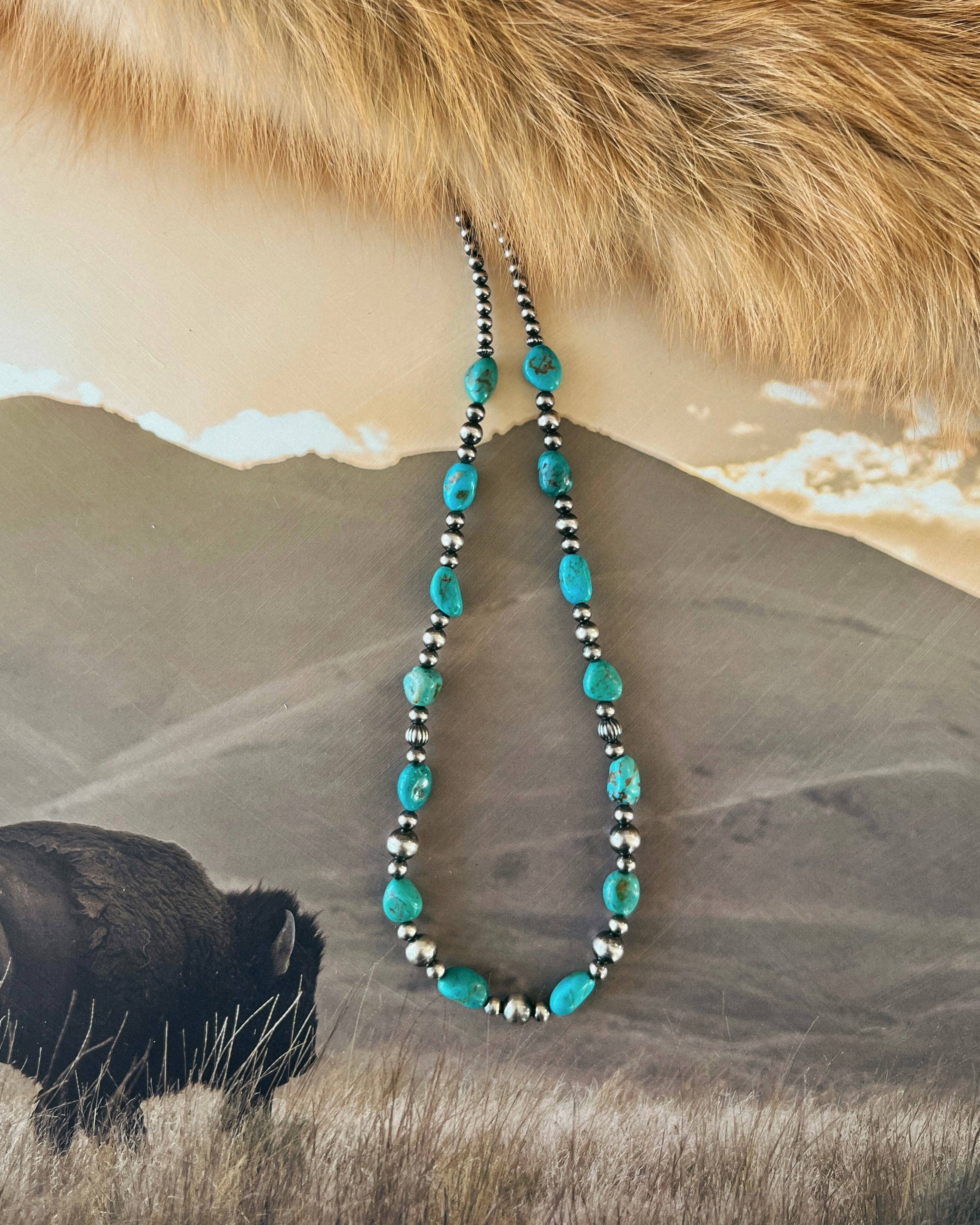 The perfect combination of turquoise and sterling silver pearls. Crafted from sterling silver 5mm, 4mm, and 8mm pearls and kingman turquoise nuggets. A stunning piece to add to your collection!