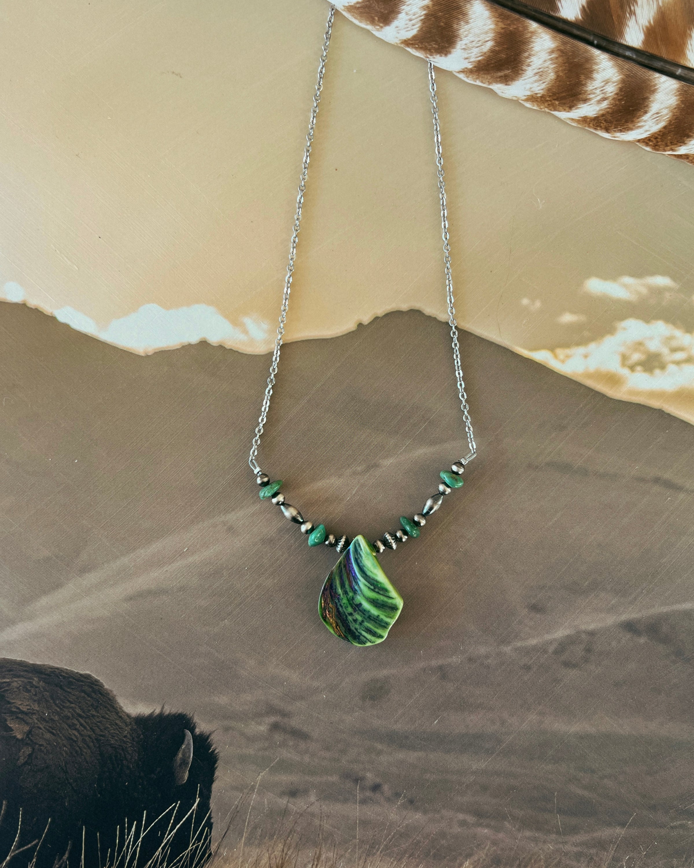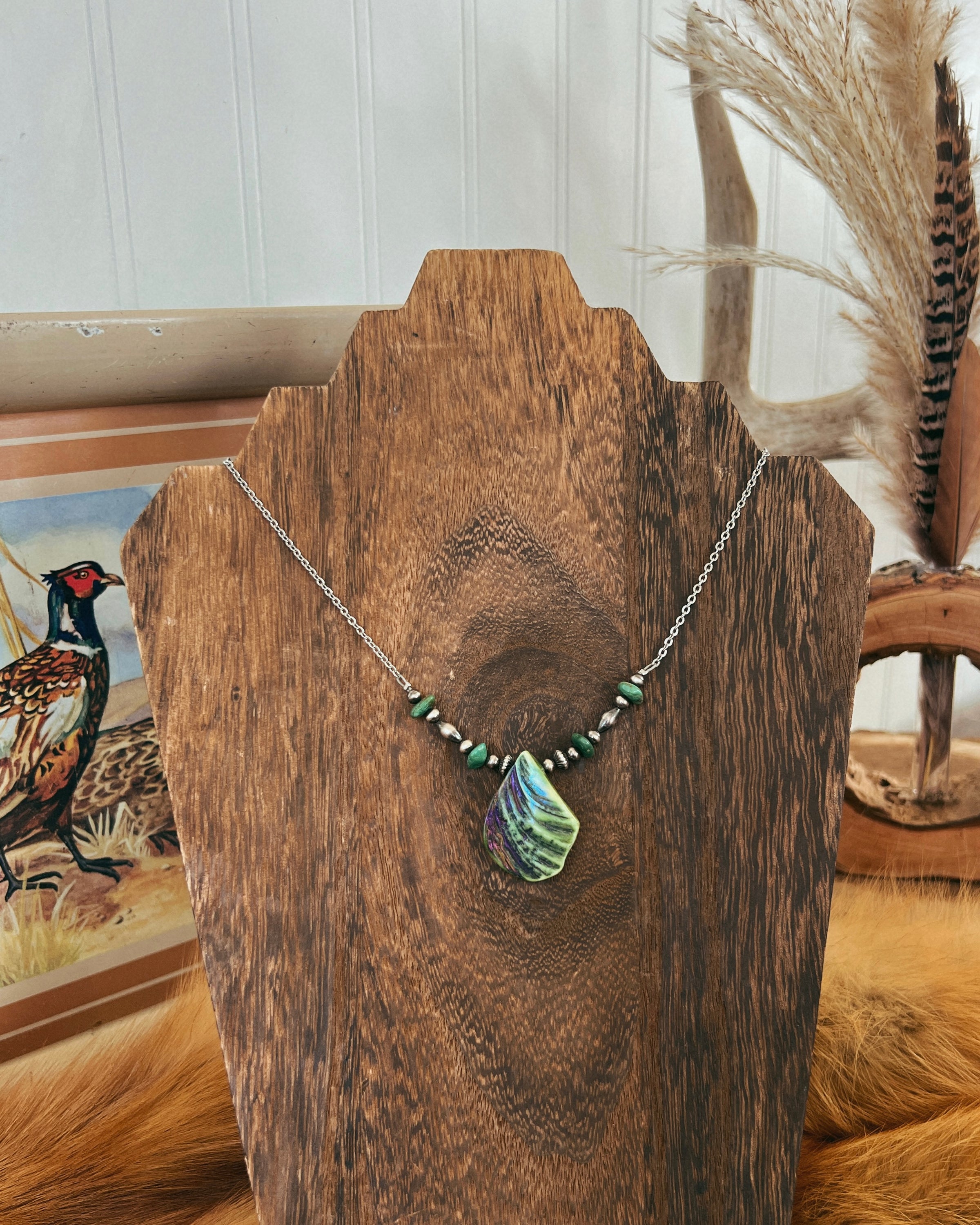 Crafted from sterling silver 5mm and 4mm pearls and natural green shell. A unique piece to add to your collection!