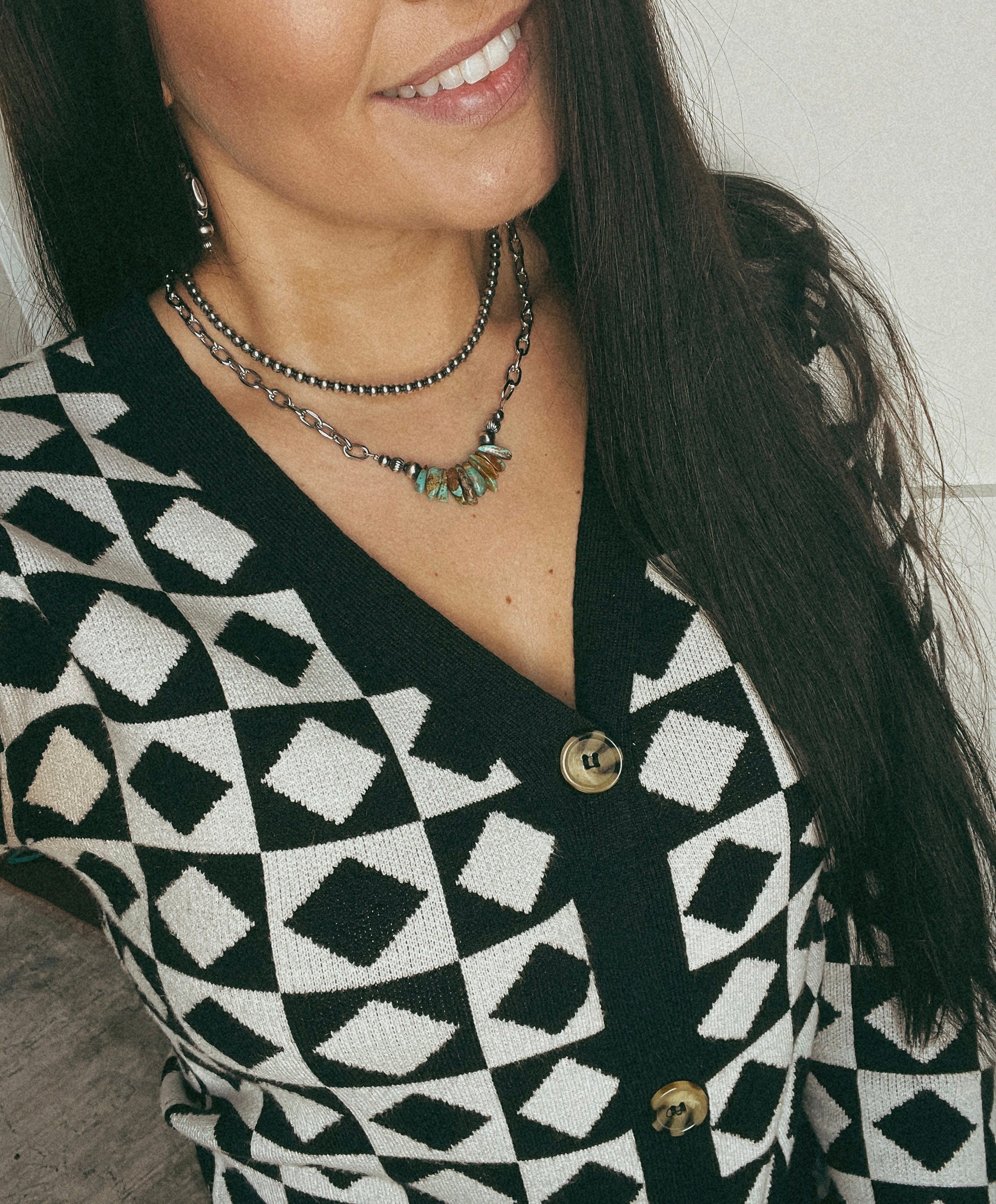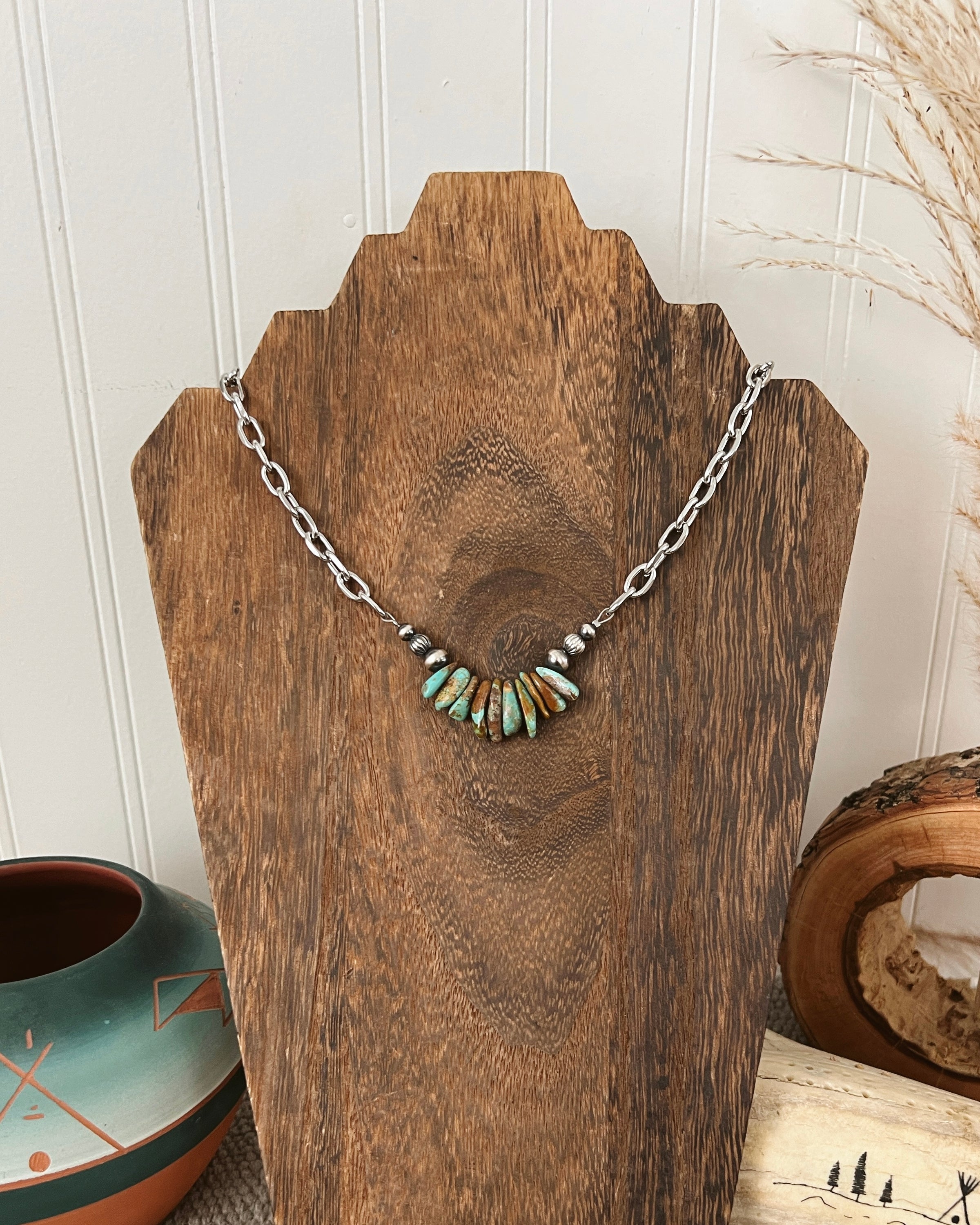 like the Riverstone Bar but bigger stones and pearls on a trendy chunky chain. The perfect stacker or statement. Crafted from sterling silver 7mm and 5 mm pearls and kingman turquoise.