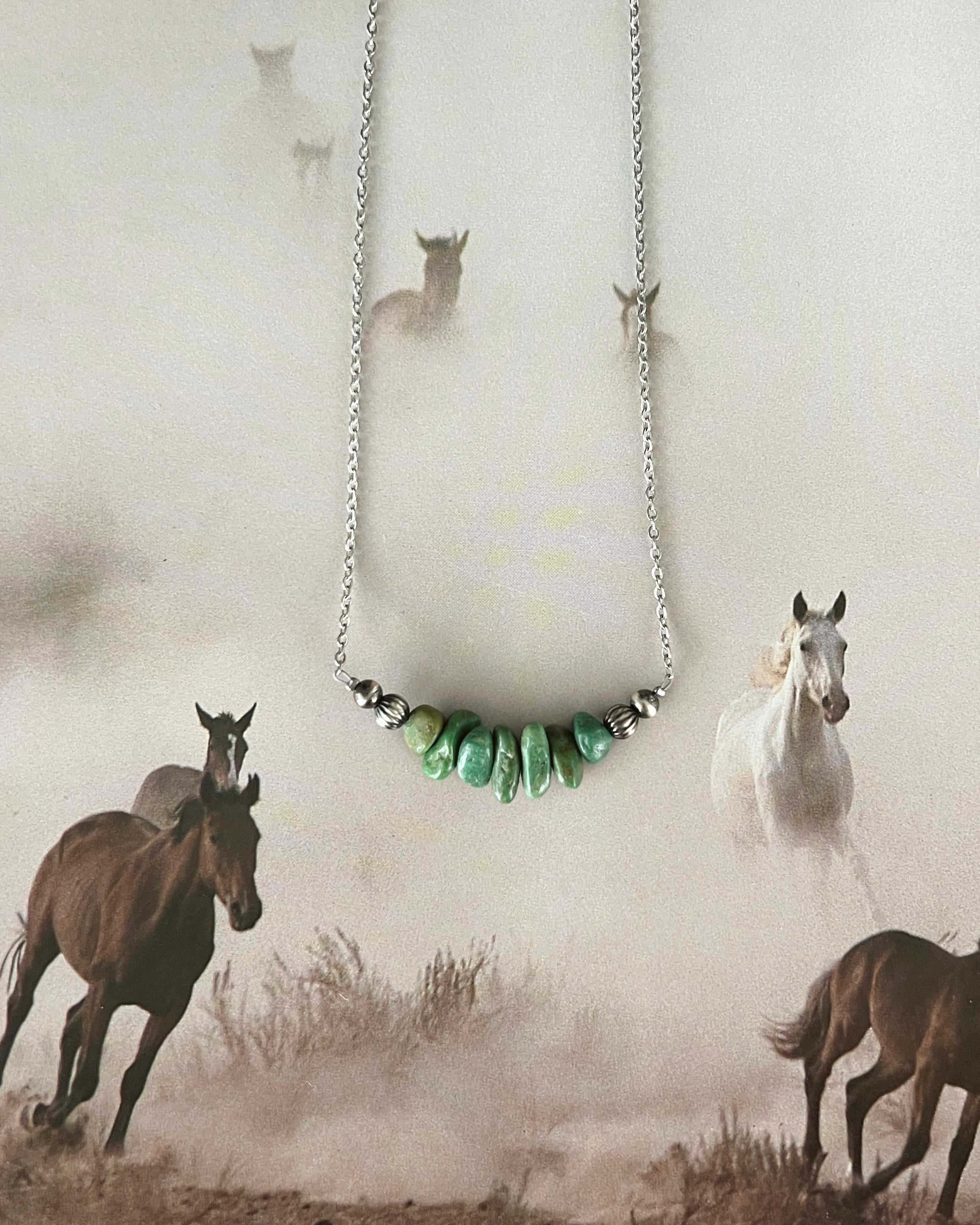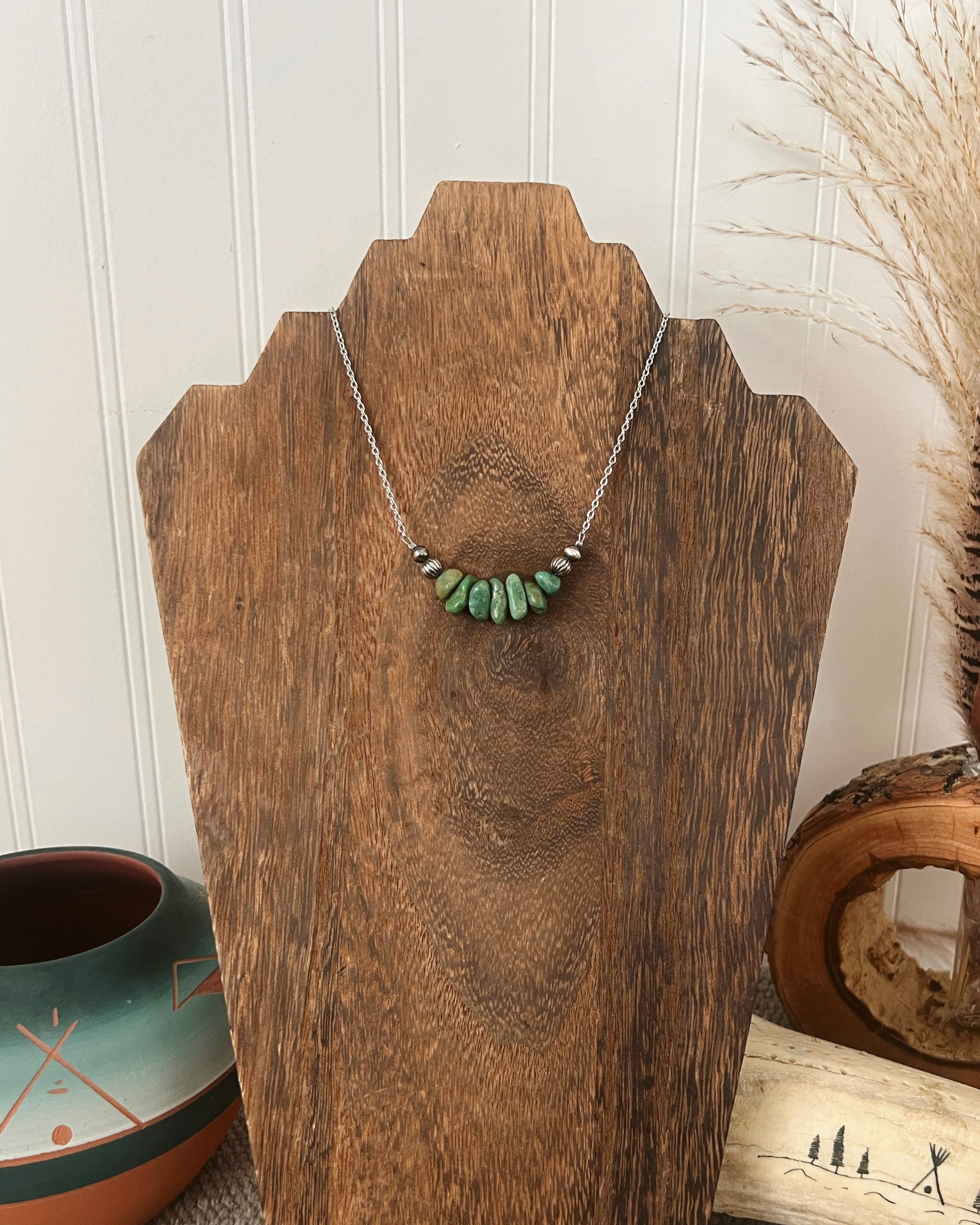 Crafted from sterling silver 7mm and 5mm pearls and beautiful genuine green turquoise. A perfect simple and timeless piece.