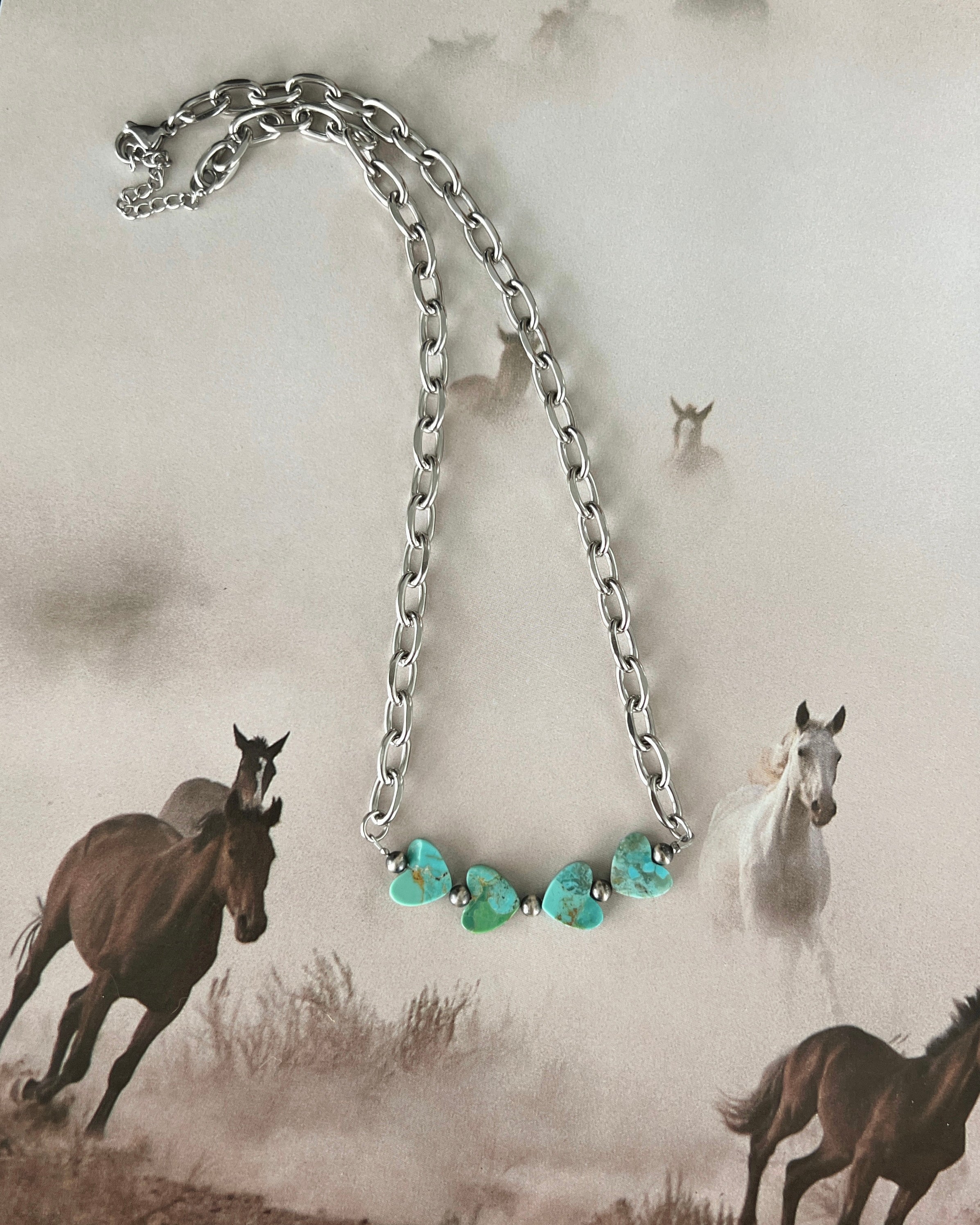Crafted from genuine kingman turquoise hearts and 4mm sterling silver pearls on a classy and trendy stainless steel chain (will not tarnish). versatile to wear by itself or stack with other jewels!