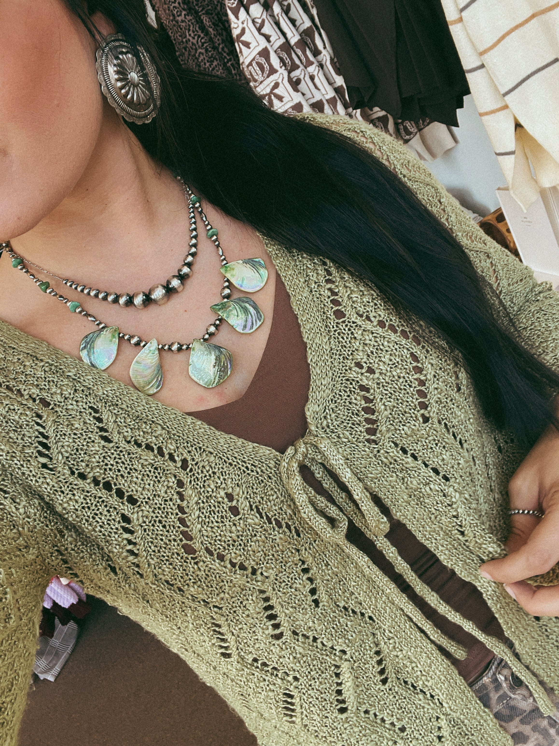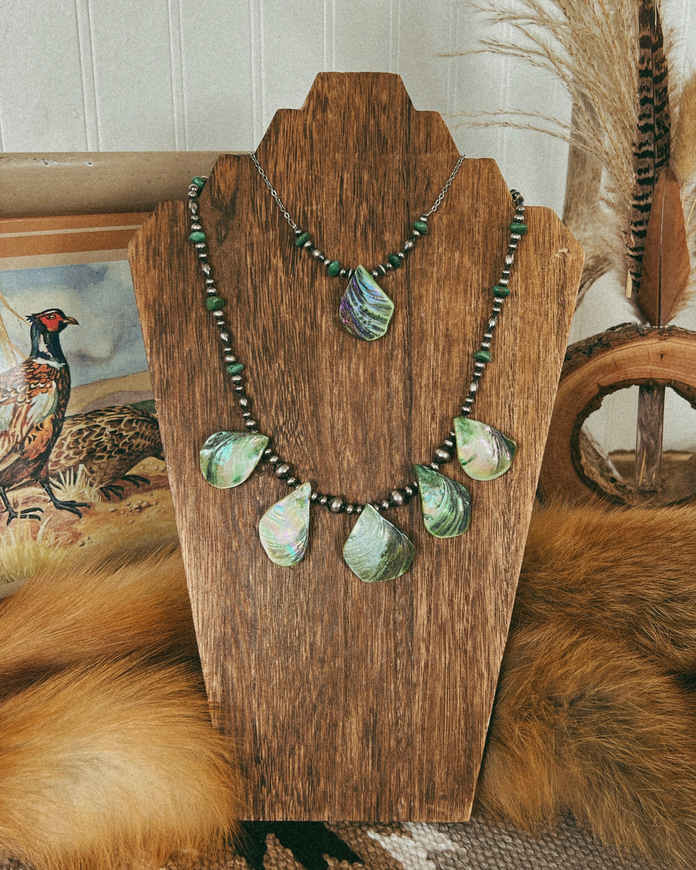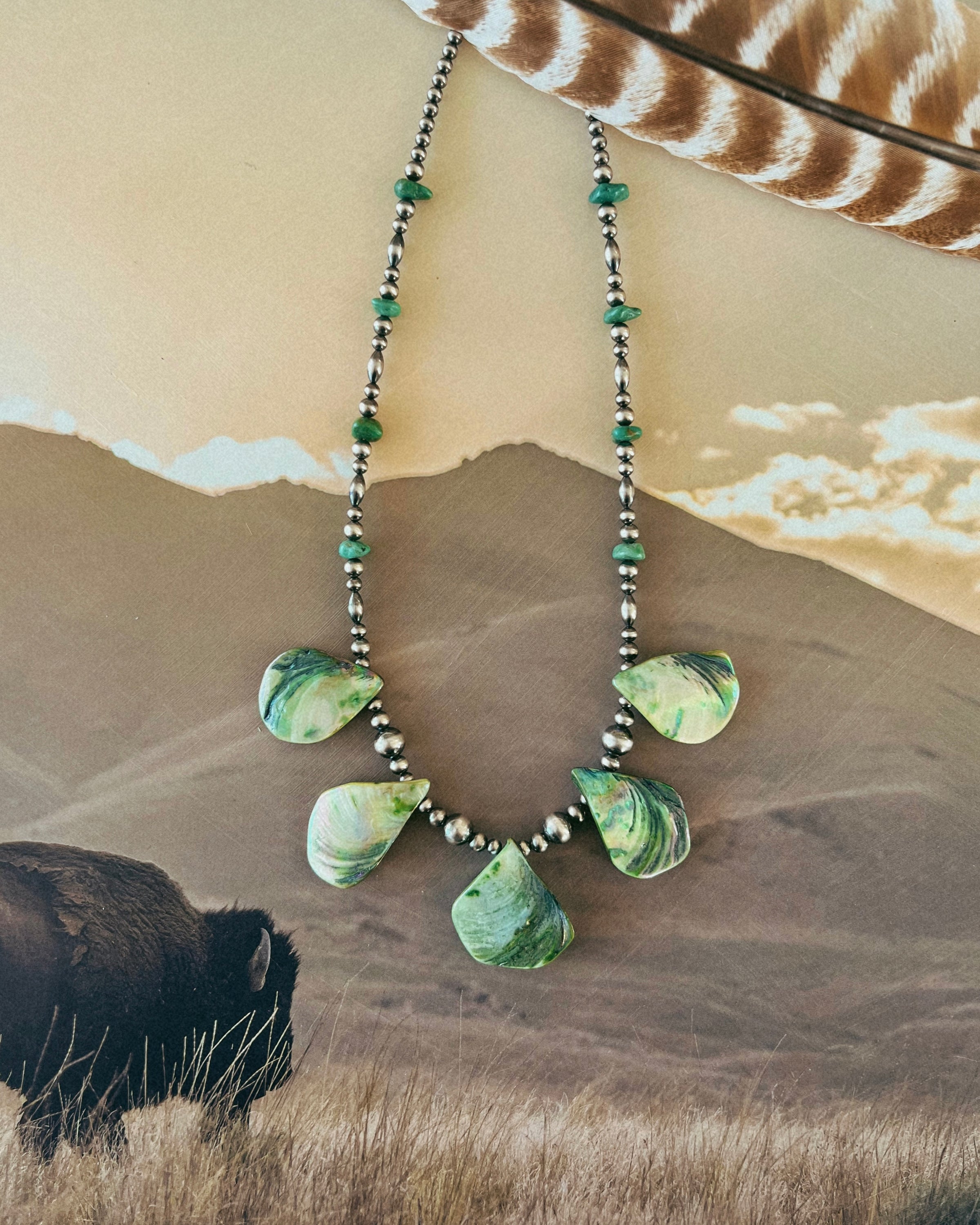 An ABSOLUTE STUNNER! Crafted from sterling silver 5mm, 4mm, and 8mm pearls and natural green shell. A stunning and unique piece to add to your collection!