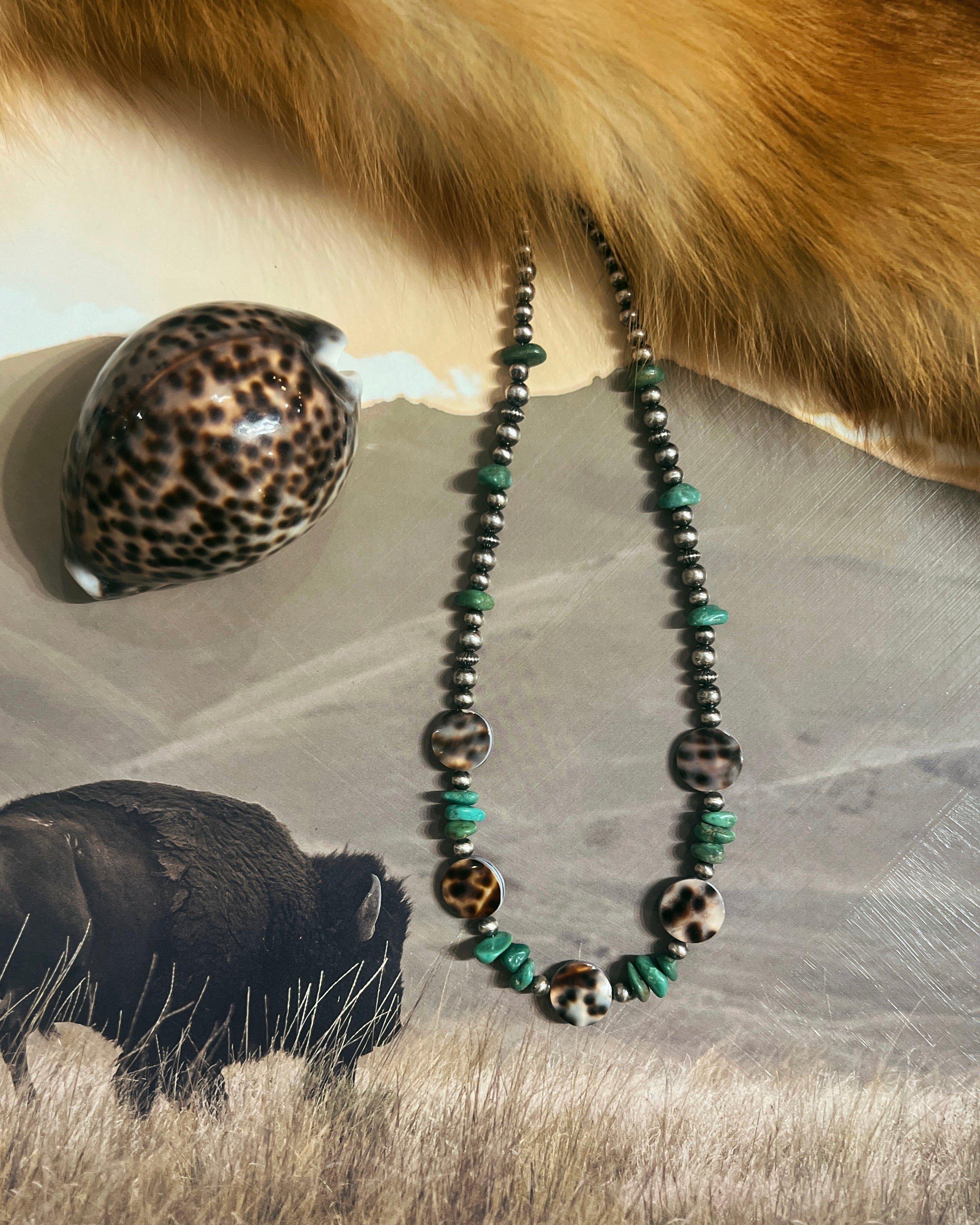 Real, raw and natural cheetah print shell? Say less. An absolute STUNNER! Crafted from sterling silver 4mm/5mm pearls, green Elise turquoise nuggets and genuine tiger shells. A super fun and unique piece to add to your collection!